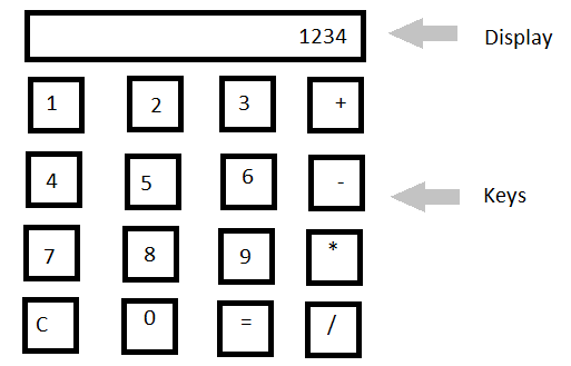 - The calculator has a display area, which is updated as the keys are pressed.